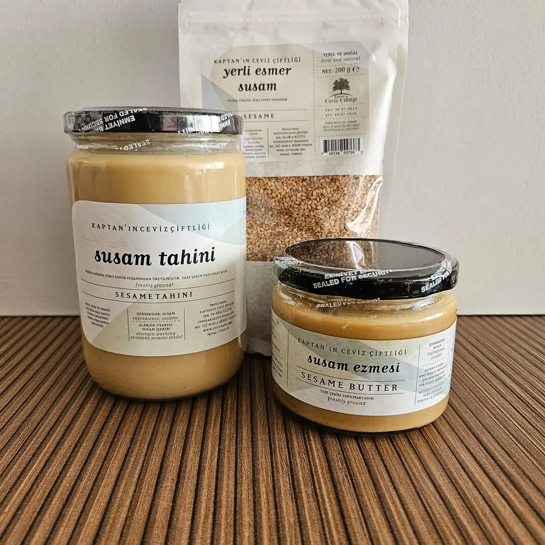 Ege’nin güneşini ve Gökova’nın bereketli esintisini içine çeken bu susamlar, renginden dolayı "altın" olarak adlandırılır. Kaptan’ın Ceviz Çiftliği olarak, bu özel mahsulü atalık tohumlardan elde ediyor ve hiçbir kimyasal işlemden geçirmeden eziyoruz. Sonuç; katkısız, şeker ilavesiz ve tamamen doğal bir susam ezmesi.